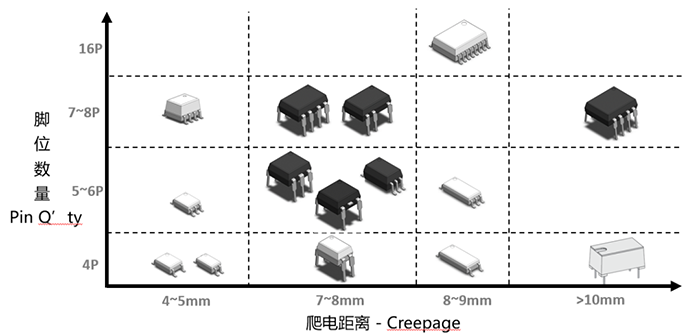 因應(yīng)不同的安全規(guī)范需求,使用者會挑選不同爬電距離的光耦;因應(yīng)不同的功能需求,